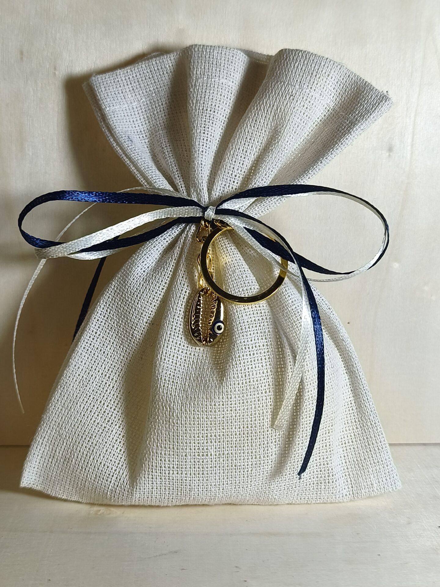Mπομπονιερα Βαπτισης Πουγκι Λινο+Κοχυλι Με Ματακι Μπρελοκ