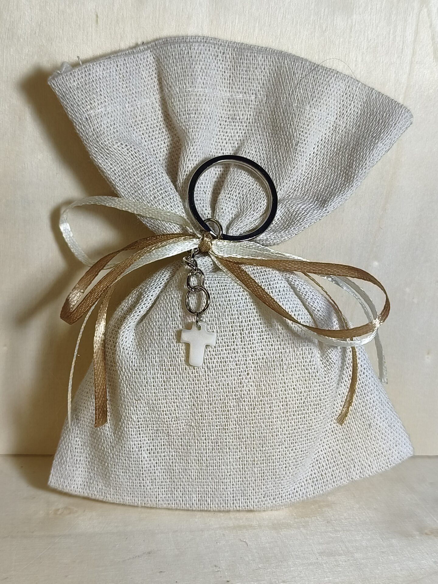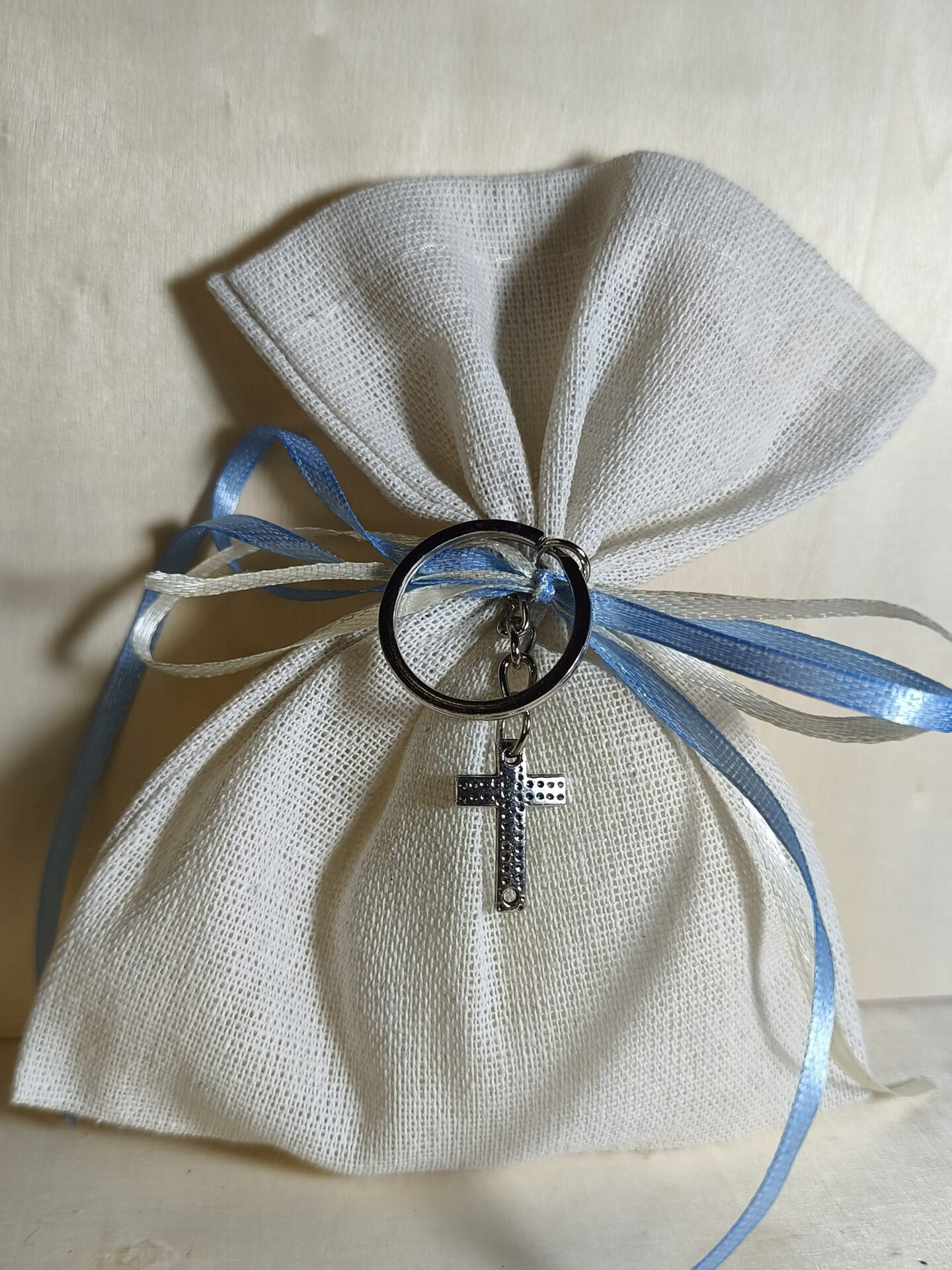 Mπομπονιερα Βαπτισης Πουγκι Λινο+Σταυρος Φιλντισι Μπρελοκ