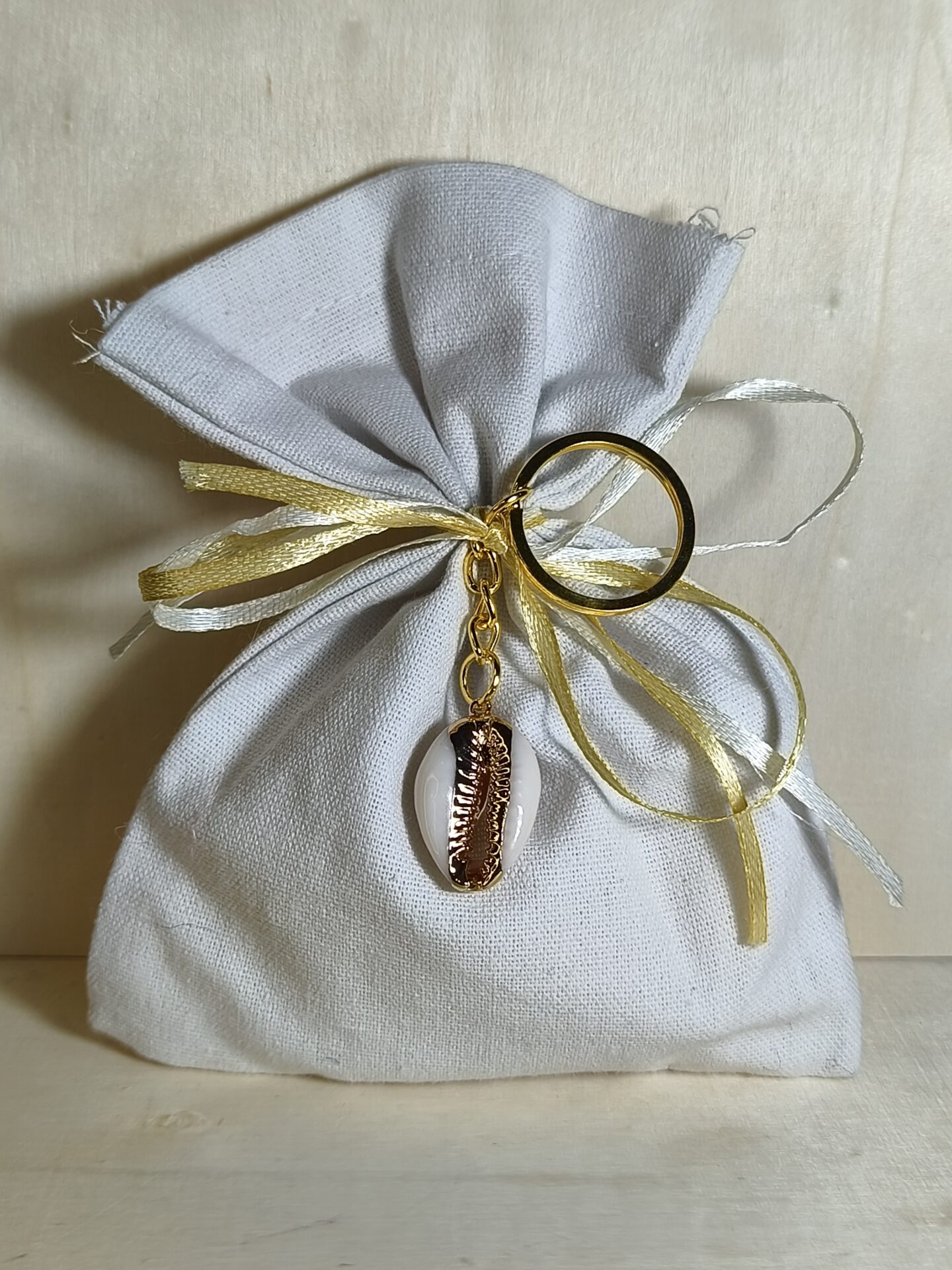 Mπομπονιερα Βαπτισης Πουγκι Λινο+Κοχυλι Μπρελοκ