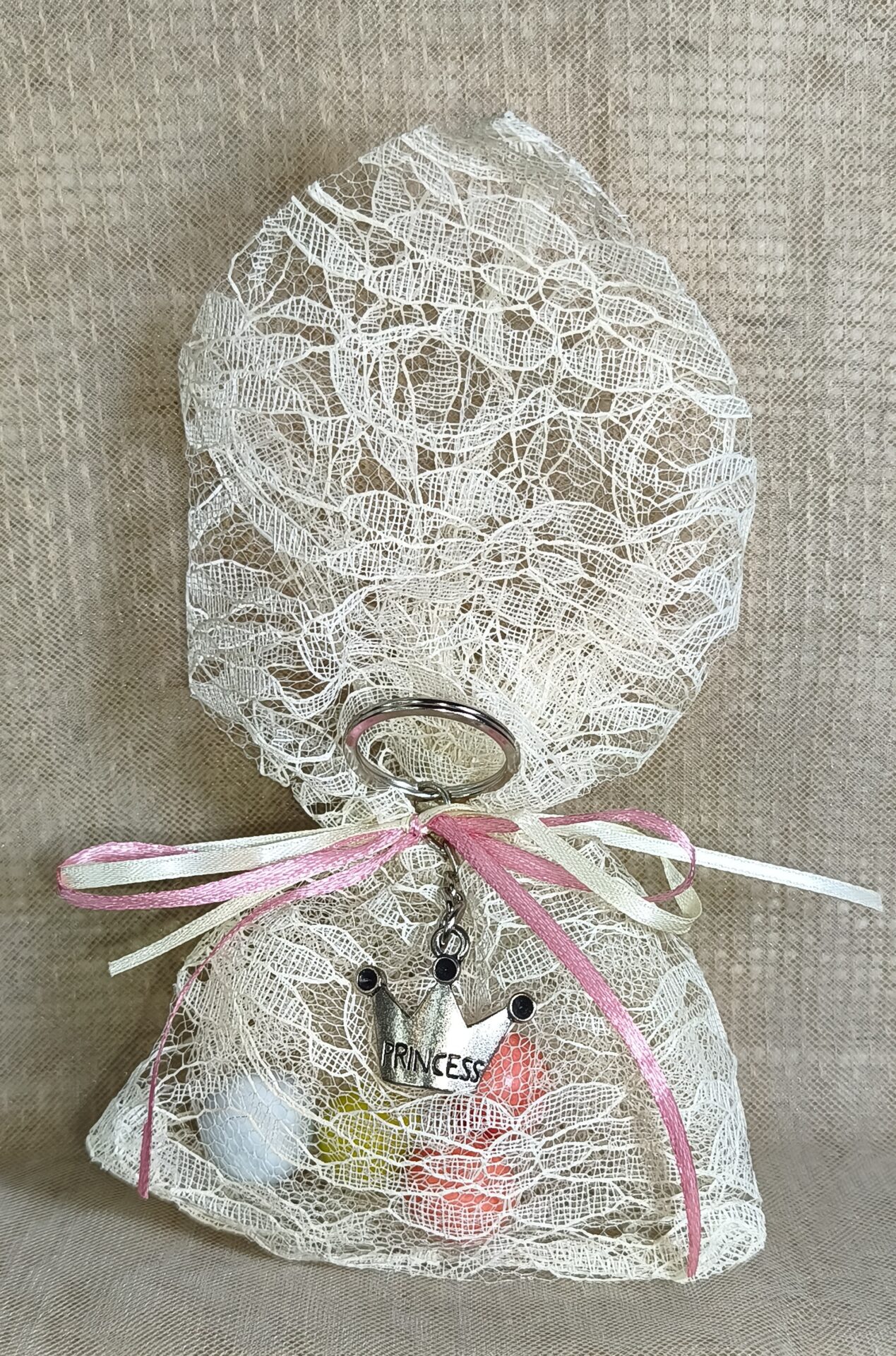 Mπομπονιερα Βαπτισης Πουγκι Δαντελα +Vintage Μπρελοκ