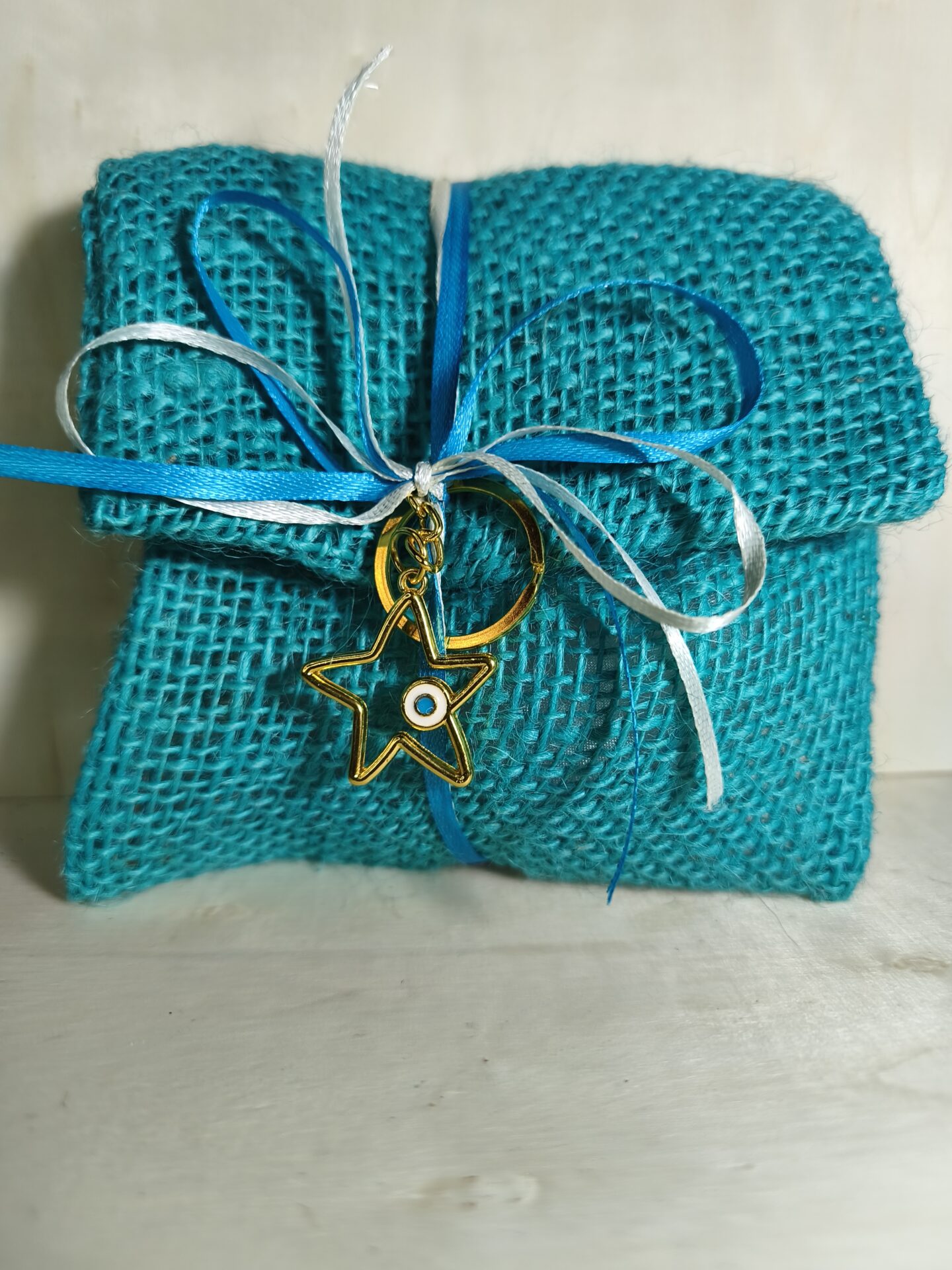 Mπομπονιερα Βαπτισης Πουγκι Λινατσα+Αστερακι Μπρελοκ