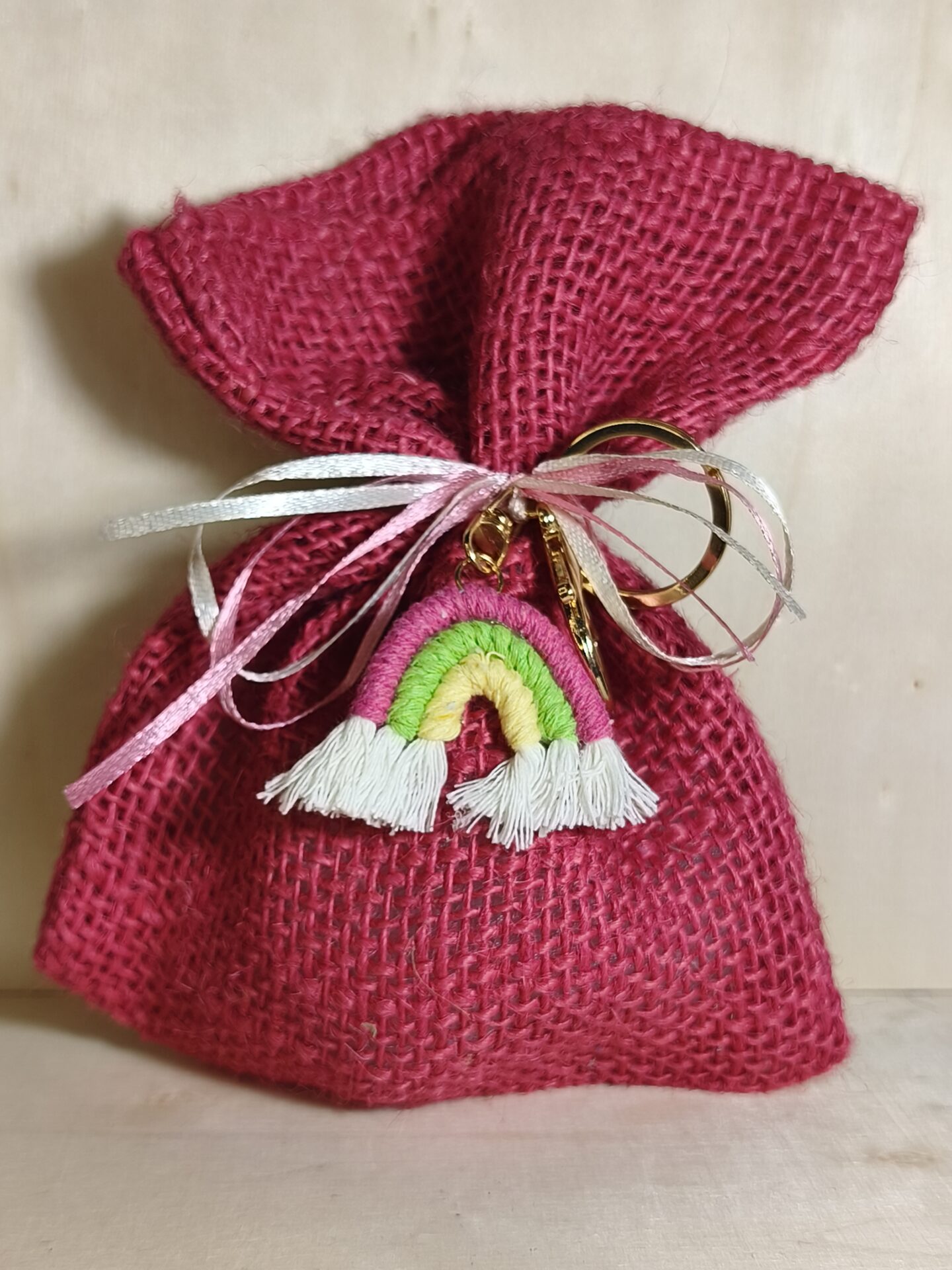Mπομπονιερα Βαπτισης Πουγκι Λινατσα+Ουρανιο Τοξο Μακραμε Μπρελοκ