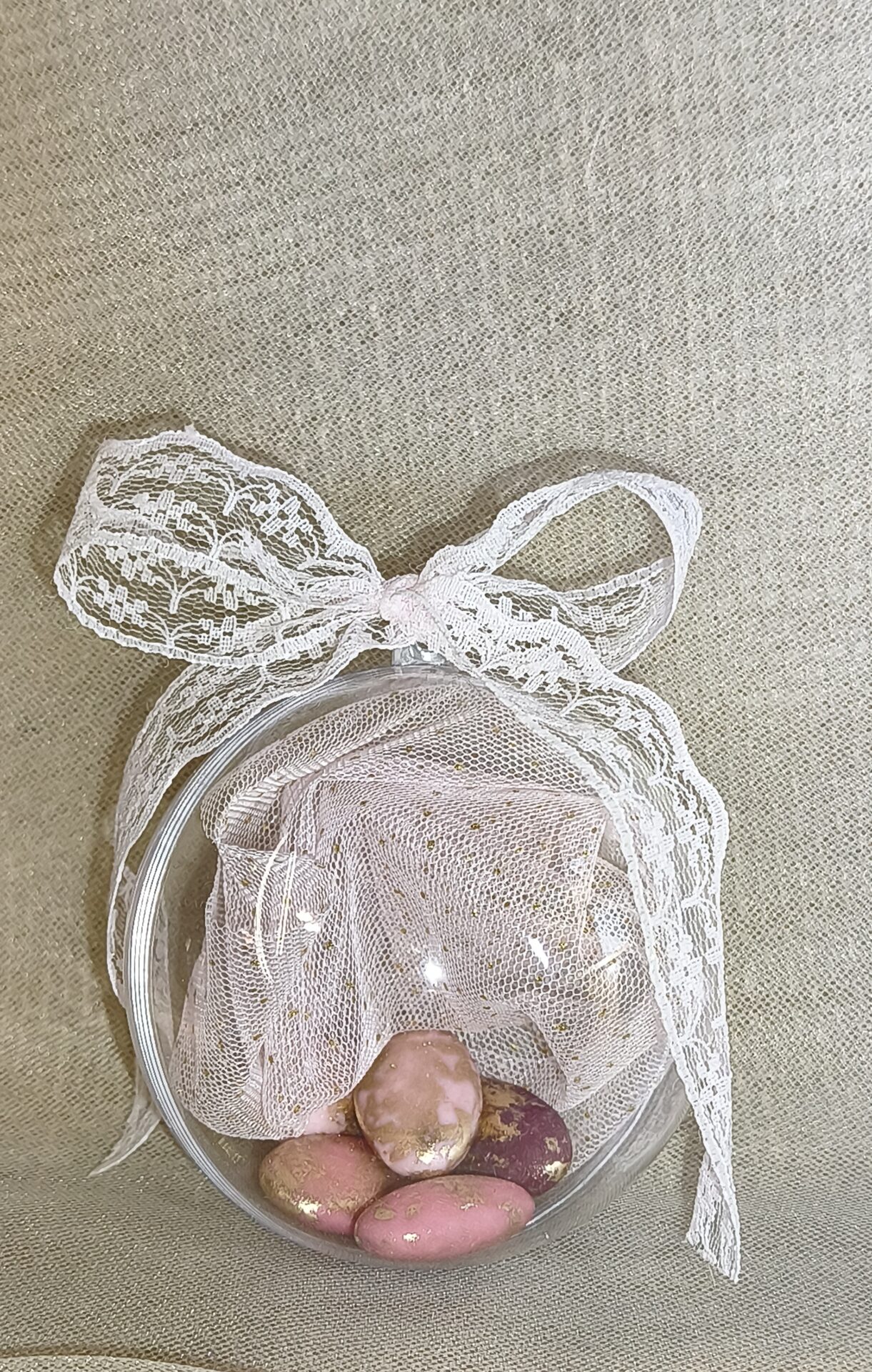 Μπομπονιερα Γαμου Μπαλα Plexiglass+Τουλι Glitter+Δαντελα