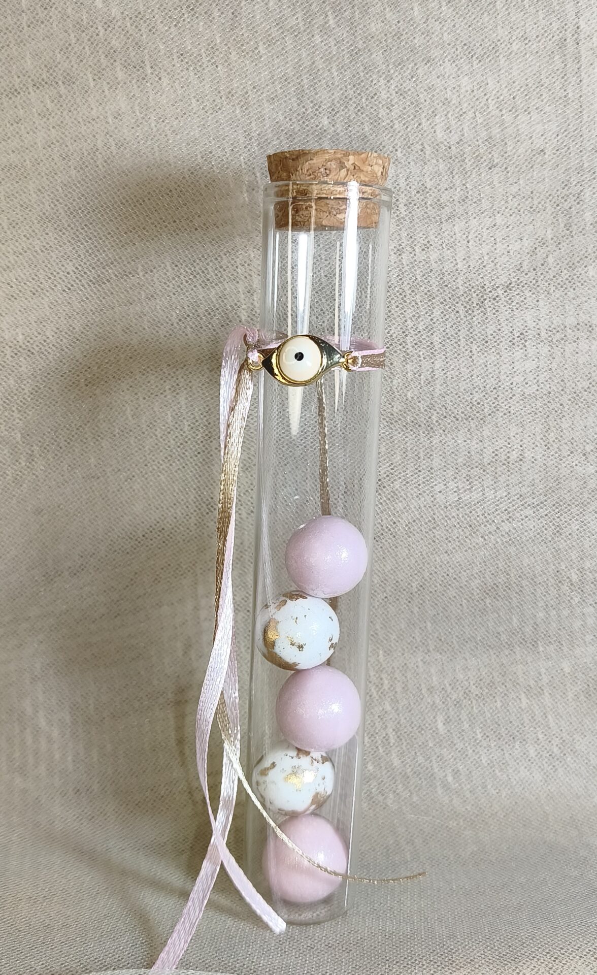 Mπομπονιερα Βαπτισης Δοκιμαστικος Σωληνας 15χ2,5cm  +Ματακι Χρυσο Ροζ