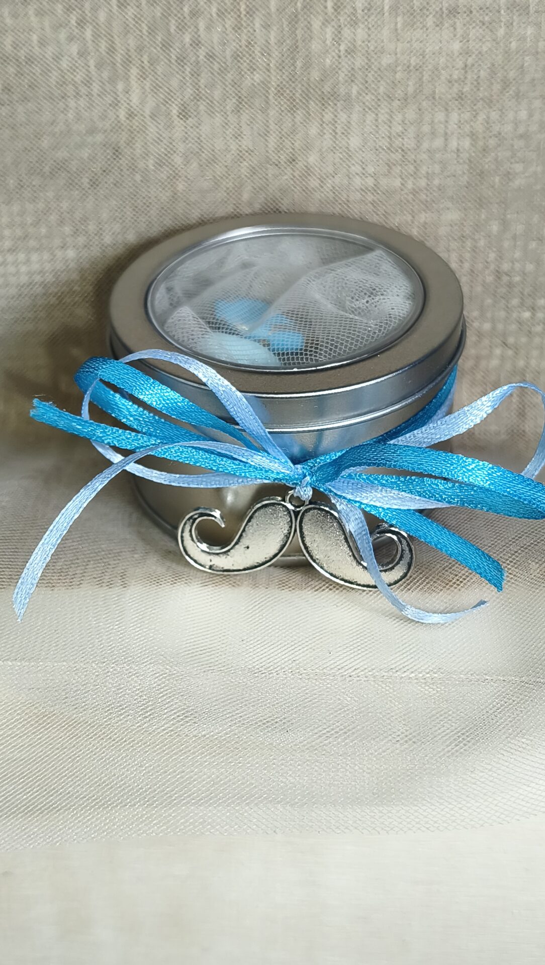 Mπομπονιερα Βαπτισης Κουτακι Μεταλλικο Διαφανες Καπακι 7,5χ4,5cm +Μουστακι
