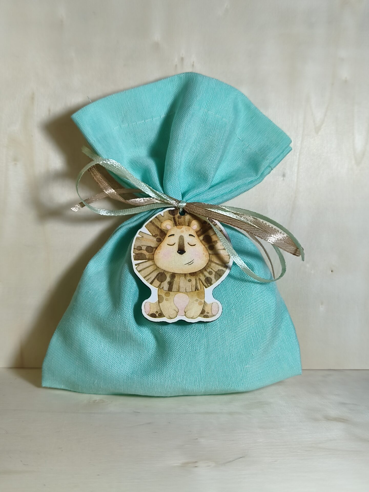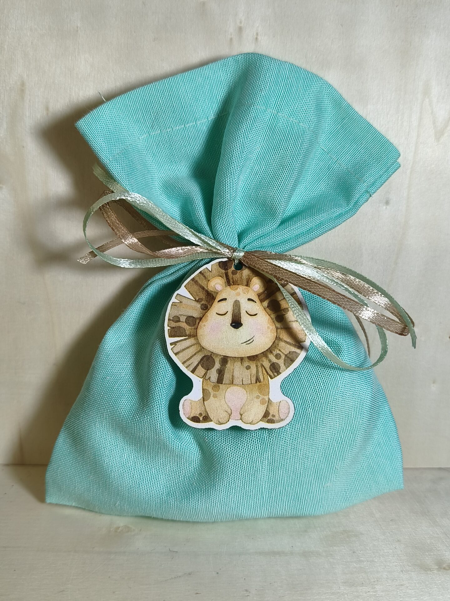 Mπομπονιερα Βαπτισης Πουγκι  βαμβακερο14χ18cm+Λιονταρακι Μαγνητακι